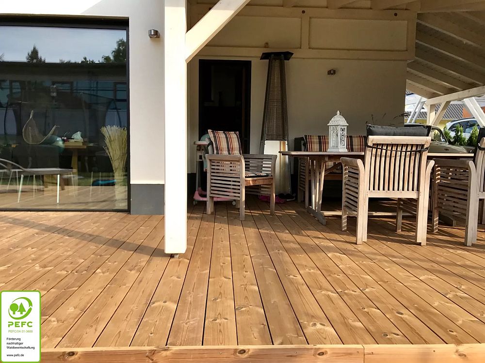 Mit seiner natürlichen Beschaffenheit fühlt sich Holz unter den Füßen warm und angenehm an. Aus diesen Gründen sind Terrassendielen aus Holz sehr beliebt. Terrassendielen, die aus heimischen Hölzern (Douglasie, Thermoesche) gefertigt werden, sind aus ökologischer Sicht am nachhaltigsten, da weite Transportwege entfallen. Die Haltbarkeit von Holzterrassen bei einheimischen Hölzern wie Douglasie / Thermoesche liegt bei 10-15 Jahren und bei exotischen Hölzern wie Bangkirai / Garapa / Ipe bei 25 – 30 Jahren. Oberflächen in fein, grob geriffelt und glatt erhältlich. Um Vergrauung zu verhindern kann man Holzterrassen mindestens einmal jährlich im einem speziellen Terrassen Öl behandeln.